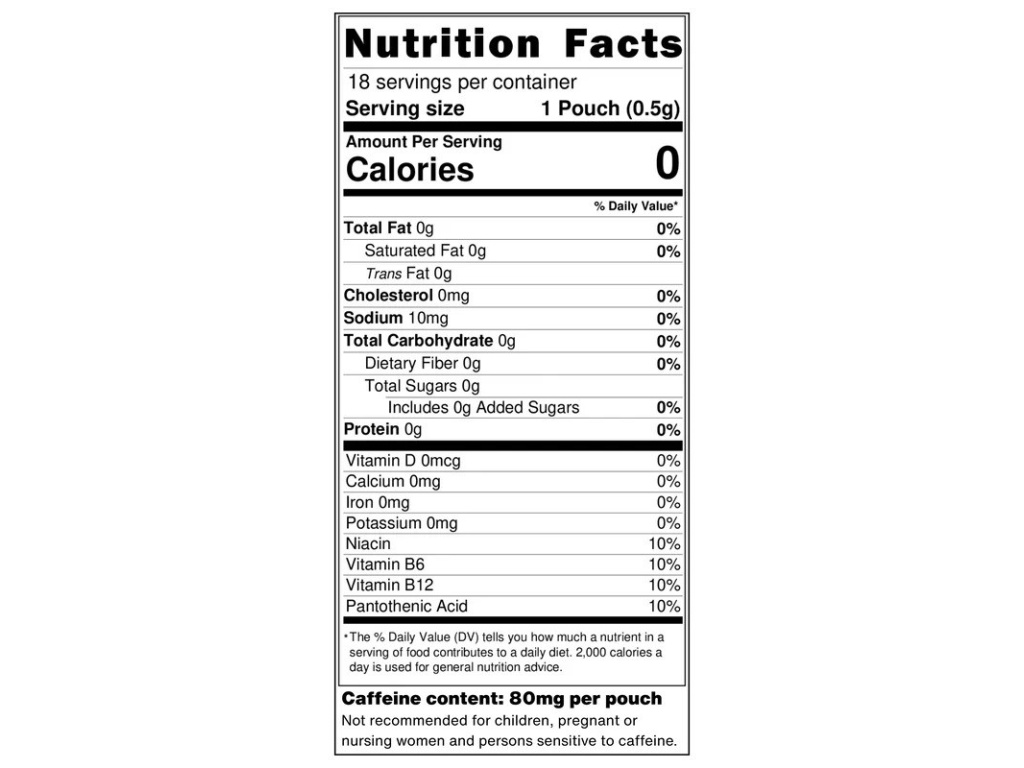 *Tento výrobek není určen pro osoby mladší 18 let, těhotné a kojící ženy, osoby trpící onemocněním srdce, vysokým krevním tlakem nebo cukrovkou, a také pro osoby alergické nebo citlivé na některou ze složek výrobku, především na kofein. Není určen jako náhrada tabáku ani jako pomůcka při odvykání kouření.