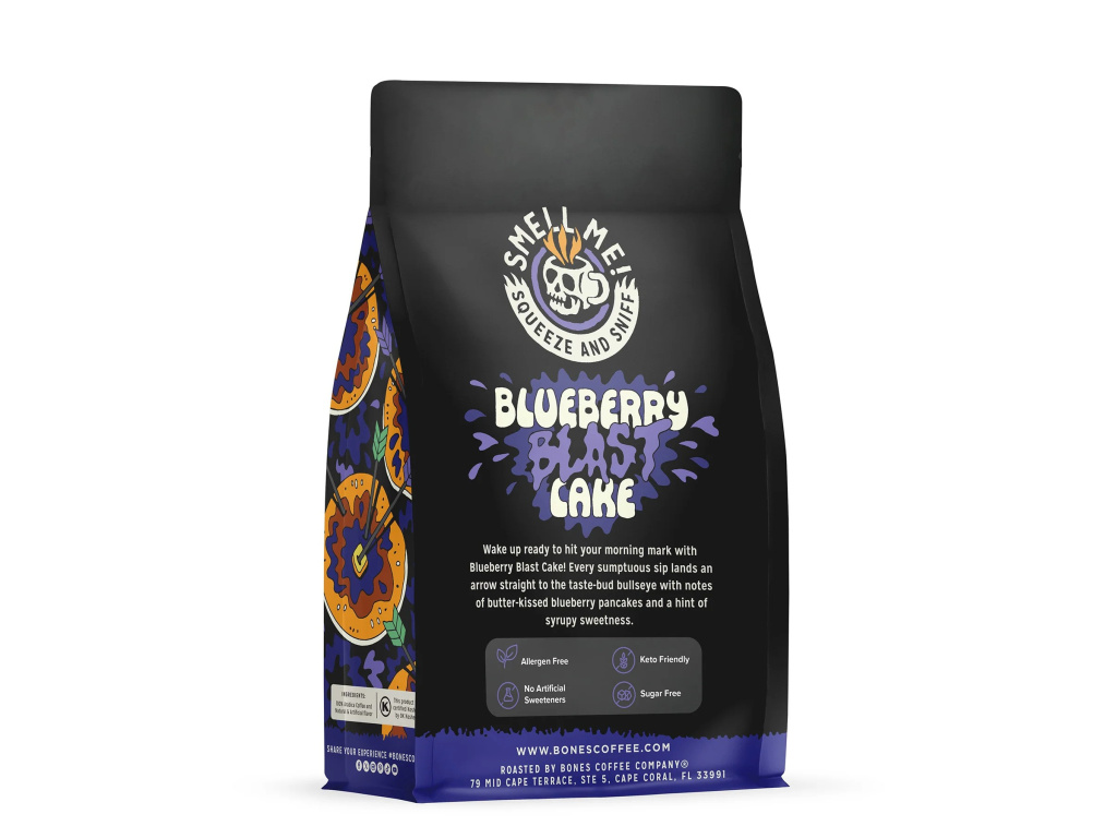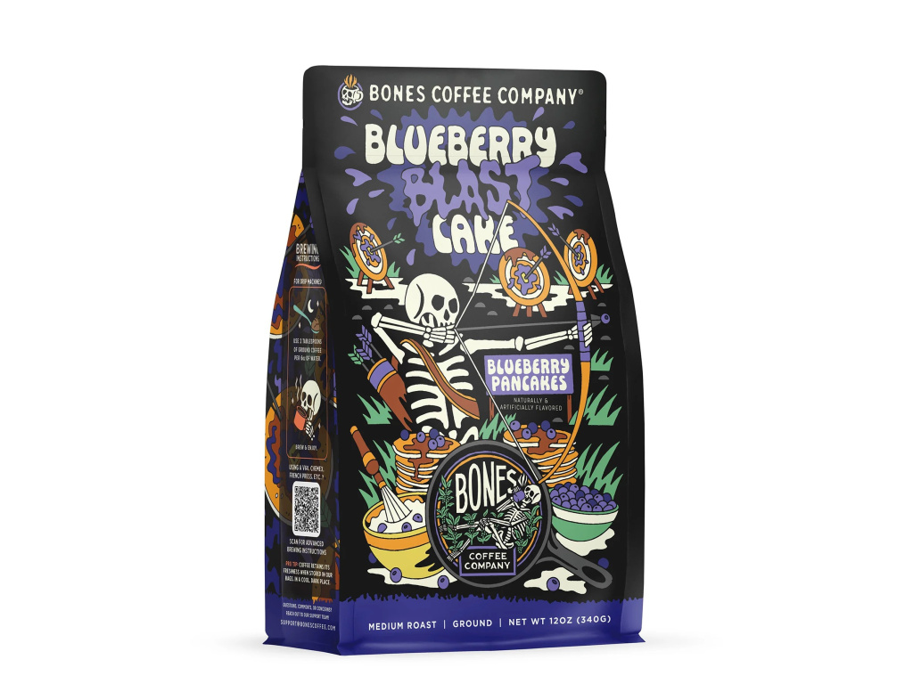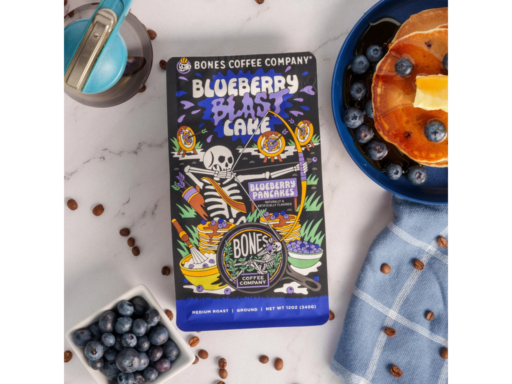 Blueberry Blast Cake od Bones Coffee Company je snídaňová klasika přetvořená do kávové podoby. Tahle středně pražená ochucená káva chutná jako čerstvě upečené borůvkové palačinky s máslovými tóny a jemnou sirupovou sladkostí – sladká, ovocná a hřejivá.