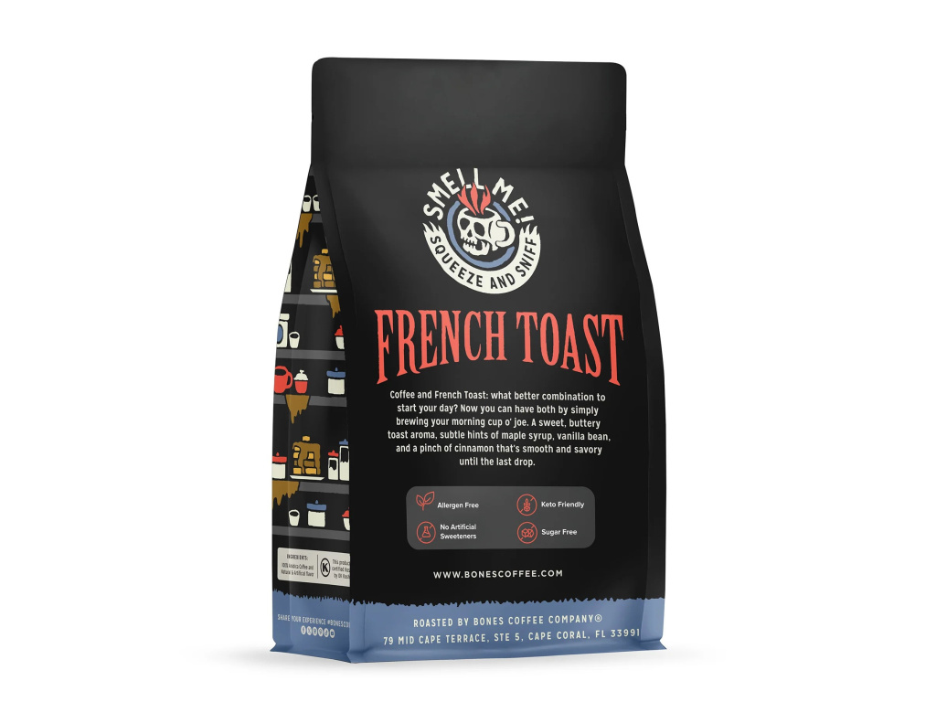 French Toast od Bones Coffee Company je snídaňová pohoda v kávovém hrnku. Tahle středně pražená ochucená káva zachycuje chuť francouzského toastu – se sladce máslovým toastovým aroma, jemným nádechem javorového sirupu, vanilky a špetkou skořice.