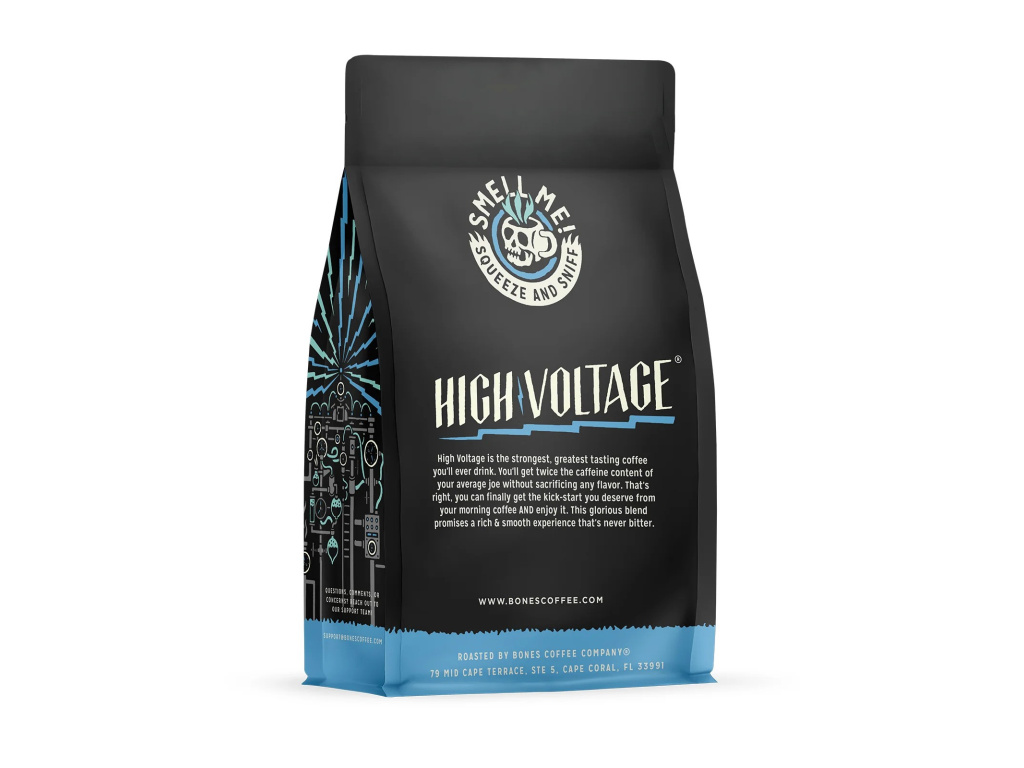 High Voltage od Bones Coffee Company je káva pro ty, kteří chtějí víc než jen běžný ranní start. Tahle středně pražená směs arabiky a robusty nabízí dvojnásobný obsah kofeinu a pořádnou dávku energie bez kompromisů v chuti.
