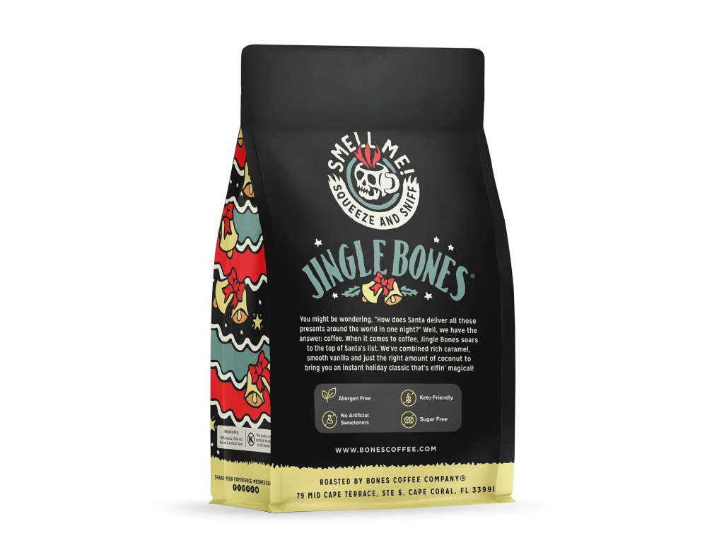 Bones Coffee praží v malých dávkách a čerstvě na objednávku, aby každý sáček nabídl maximální chuť a aroma. Jingle Bones je káva stvořená pro sdílení s přáteli a rodinou – a pro to, aby tvá rána byla o něco veselejší.