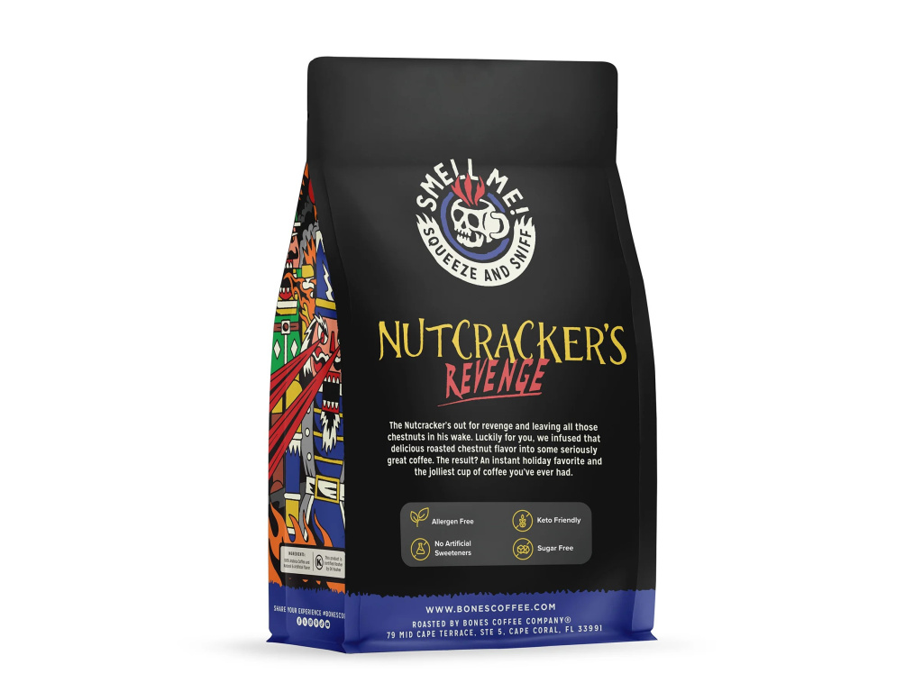 Nutcracker’s Revenge od Bones Coffee Company je středně pražená ochucená káva s chutí pražených kaštanů, která dokonale vystihuje atmosféru zimy a svátků. Pokud miluješ kaštany, tahle příchuť je přesně pro tebe – hřejivá, jemně oříšková a neuvěřitelně pohodová.