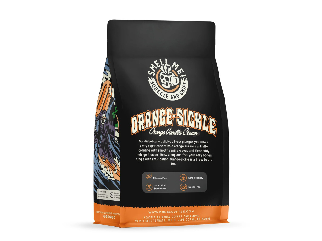 Orange Sickle od Bones Coffee Company je ďábelsky dobrá kombinace svěžesti a krémové sladkosti. Tahle středně pražená ochucená káva spojuje šťavnatý pomeranč s hladkou vanilkou a jemným krémovým podtónem, inspirovaným legendární orange creamsicle.