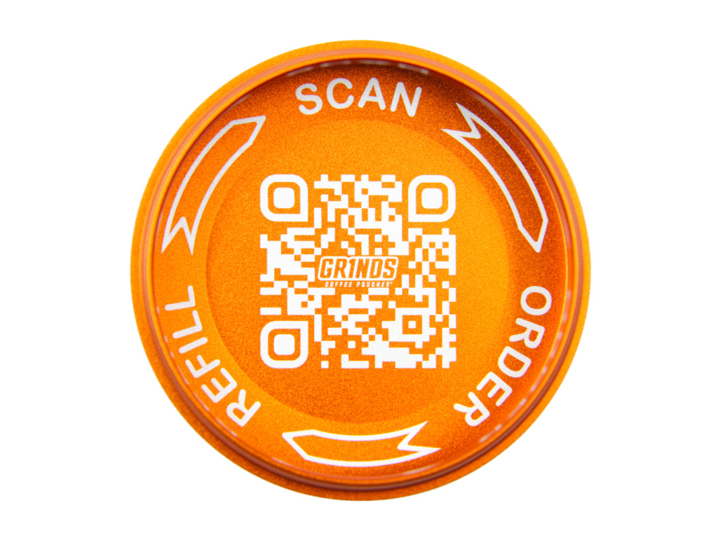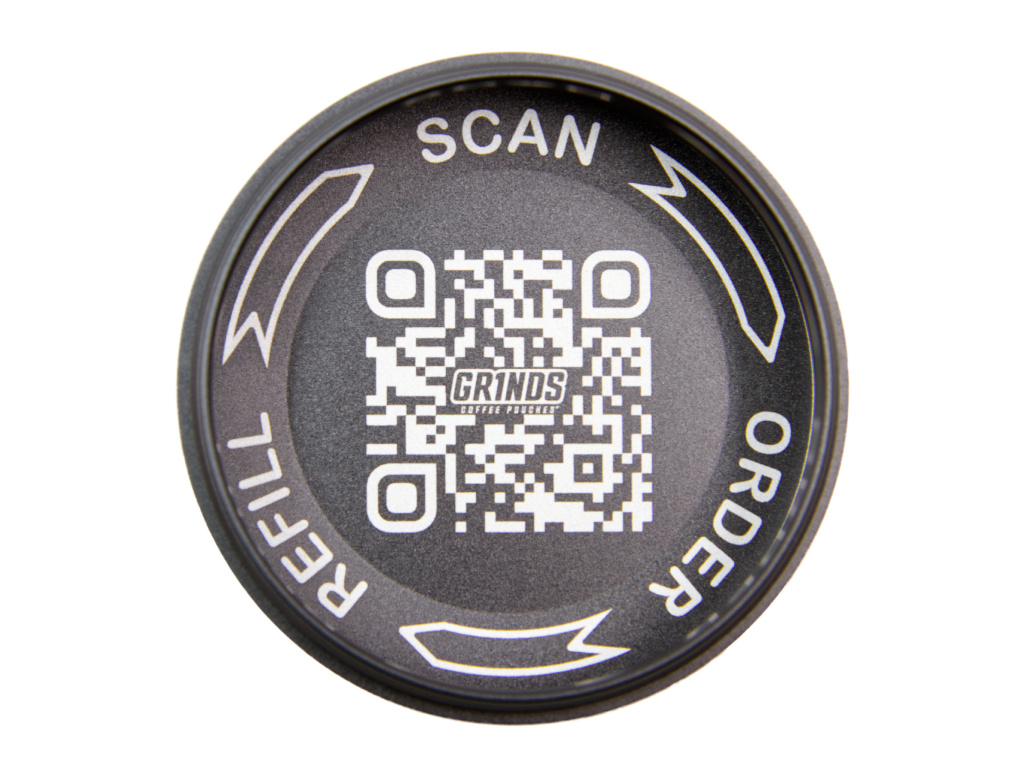 - QR kód uvnitř víčka – SCAN / ORDER / REFILL na grinds.cz